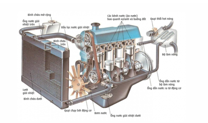 Nước làm mát được đổ vào một bình chứa gắn với két làm mát trước khi nó di chuyển quanh động cơ thông qua các đường ống và mạch nước nằm trong động cơ.